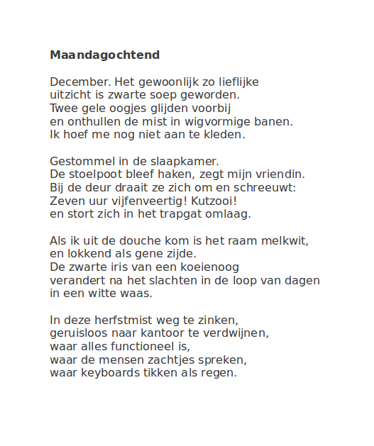 Onrust in poëzieland. Door een fout ‘onduidelijkheid’ in de website van de Nationale Turing Gedichtenwedstrijd zijn enkele honderden gedichten waarschijnlijk om verkeerde redenen uit de competitie verdwenen. Alexis de Roode, zelf al meerder malen in de prijzen gevallen, kaartte de zaak aan via facebook. Zijn gedicht ‘Maandagochtend’ bleek – eenmaal in het systeem – geen gedicht meer, maar een stuk proza, zonder de regelafbrekingen die bij een gedicht horen.