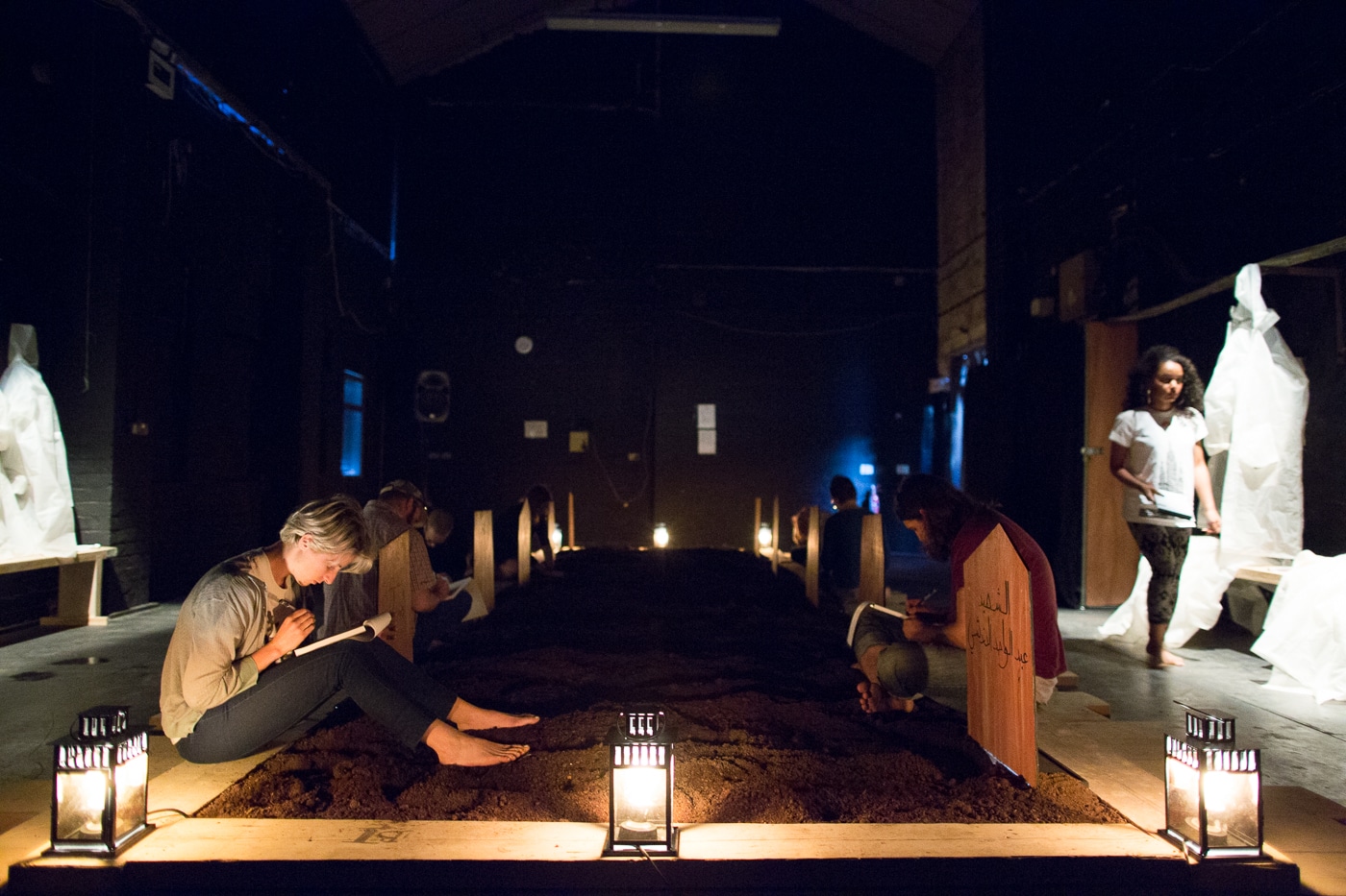Tania El Khoury hoorde in 2013 van het Syrische alternatief: de privébegrafenis in eigen achtertuin, of bij gebrek daaraan in een anoniem stadspark, zonder grafsteen of herdenkingsplek. Zo’n actie is zowel een uiting van angst als een daad van verzet: dit zijn doden die de regering niet meer kan misbruiken. ‘Het stuk is oorspronkelijk ook niet bedoeld voor het Europese publiek. Het is in Libanon gemaakt en de tekst was ook in het Arabisch. Het laatste waar ik aan dacht was het Europese publiek. Het idee was om de naamloze doden een graf te geven, met mooi gekalligrafeerde letters erop. In het echt zijn veel van deze mensen zonder grafsteen begraven, anoniem. Ik wilde het daarna in andere talen doen, met andere grafstenen, en steeds weer de lokale aarde. Elk land heeft andere aarde, tenslotte.’