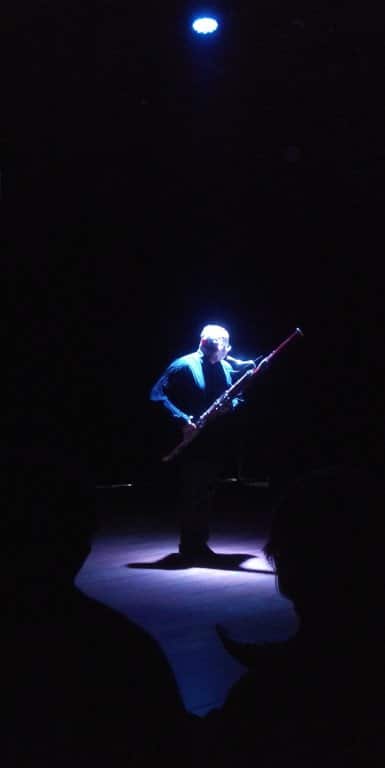 De eveneens speciaal voor hem gecomponeerde Sequenza XII van Luciano Berio is al net zo’n klankverkenning, waarbij Gallois vaak ook met ‘valse lucht’ moet spelen. Ondanks wat virtuoos vuurwerk, benadrukt Berio met veelal lange lijnen vooral de sonore kant van de fagot. Gallois speelt zonder lessenaar en staat frontaal naar het publiek, nog altijd blauw uitgelicht. Hij buigt aan begin en einde diep, waarbij hij zijn instrument als een soort offerande ten hemel heft.