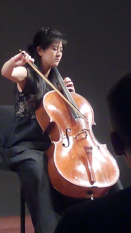 Ayana Kamimura is qua intonatie en trefzekerheid zijn meerdere in Bunraku van Toshiro Mayuzumi. Sierlijk weeft zij slingers van pizzicati en glissandi, waarbij zij haar cello op momenten laat klinken als een koto, een Japanse citer. Zij ademt en snuift ondertussen echter zo heftig dat het lijkt alsof ze met geweld de noten uit haar instrument moet persen. Dat leidt behoorlijk af.