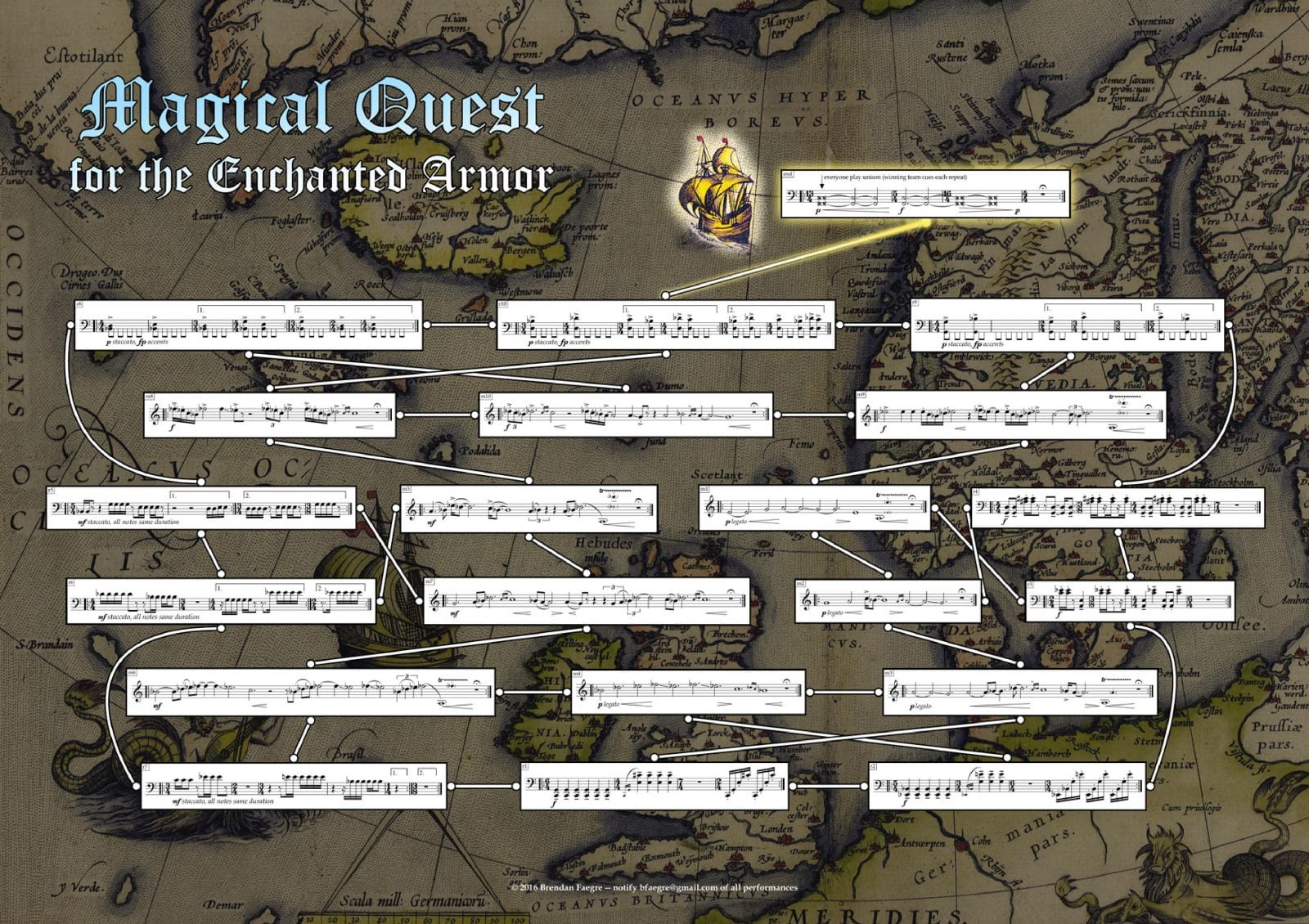 ‘Hij houdt wel van een grapje’, zegt Fedor Teunisse van Slagwerk Den Haag en roept de componist Brendan Faegre (1985) op het podium van het Bimhuis. De jonge componist vertelt hoe de slagwerkers en de Biënnale Cello Band zijn Magical Quest for the Enchanted Armor moeten uitvoeren. ‘It’s a game piece’, zegt hij enthousiast. ‘De vier slagwerkers en vier cellisten moeten in paren een route kiezen door muzikale fragmenten, die via verschillende wegen te bereiken zijn. Wie het eerst bij de schat is, mag de slotfrase bepalen.’