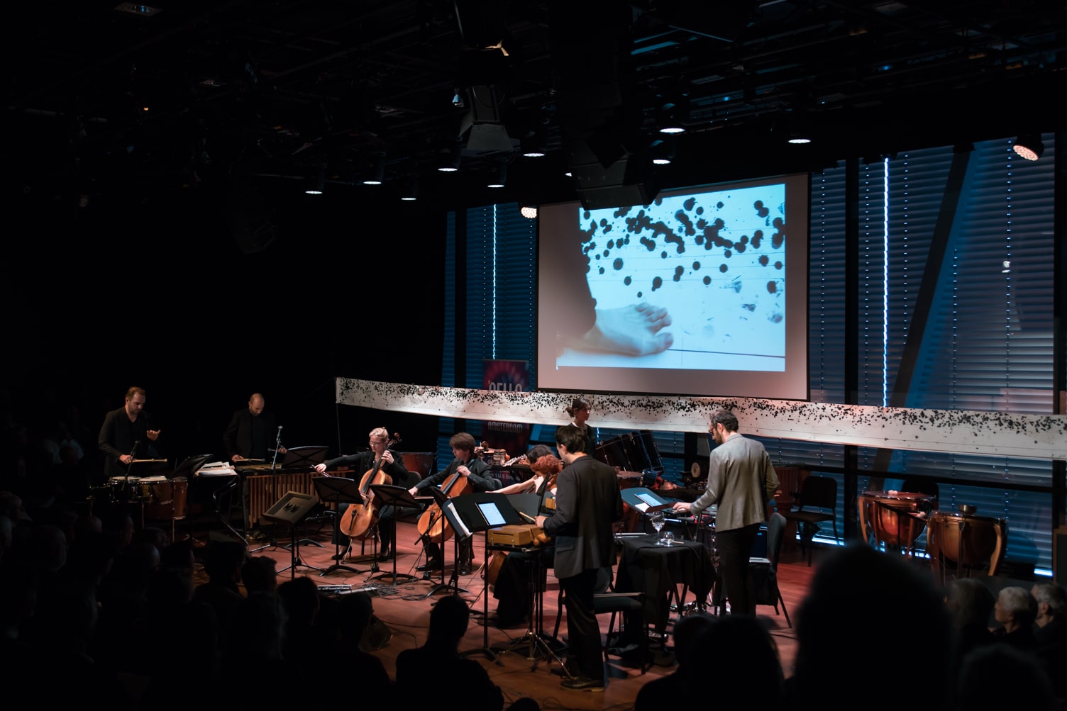 Het avondconcert in de Grote Zaal van het Muziekgebouw aan ’t IJ werd geopend door Cello8tet Amsterdam met Symphony for Eight van Philip Glass. Diens aanstekelijk pulserende drieklanksmotieven werden ontsierd door de slecht geïntoneerde sololijnen van de eerste cellist, die van lieverlee zijn collega’s meesleepte.