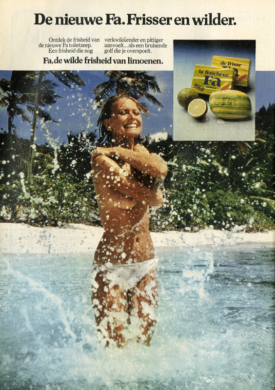 De eerste blote vrouwenborst die ik in mijn leven bewust waarnam was de vrolijk zwabberende tiet van het meisje in de Fa-reclame. Het moet ergens diep in de jaren zeventig van de vorige eeuw zijn geweest. Dezelfde tijd dat de Pacifisties Socialistiese Partij ook zoiets deed met een koe op de achtergrond.