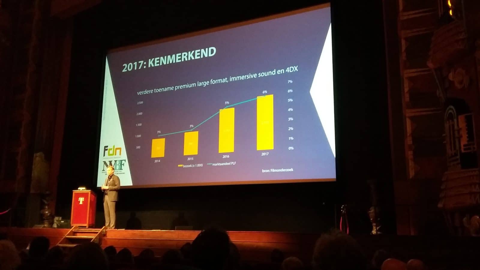 Ook terugkijkend was zijn stemming zonnig. ‘Heel gezond’, noemde hij het afgelopen bioscoopjaar. Voor het tiende achtereenvolgende jaar is het aantal bezoekers gestegen, in 2017 met 5,3% naar bijna 36 miljoen. Daarmee doet Nederland het beter dan bijvoorbeeld de Verenigde Staten, Frankrijk of Duitsland, waar de cijfers stagneren.
