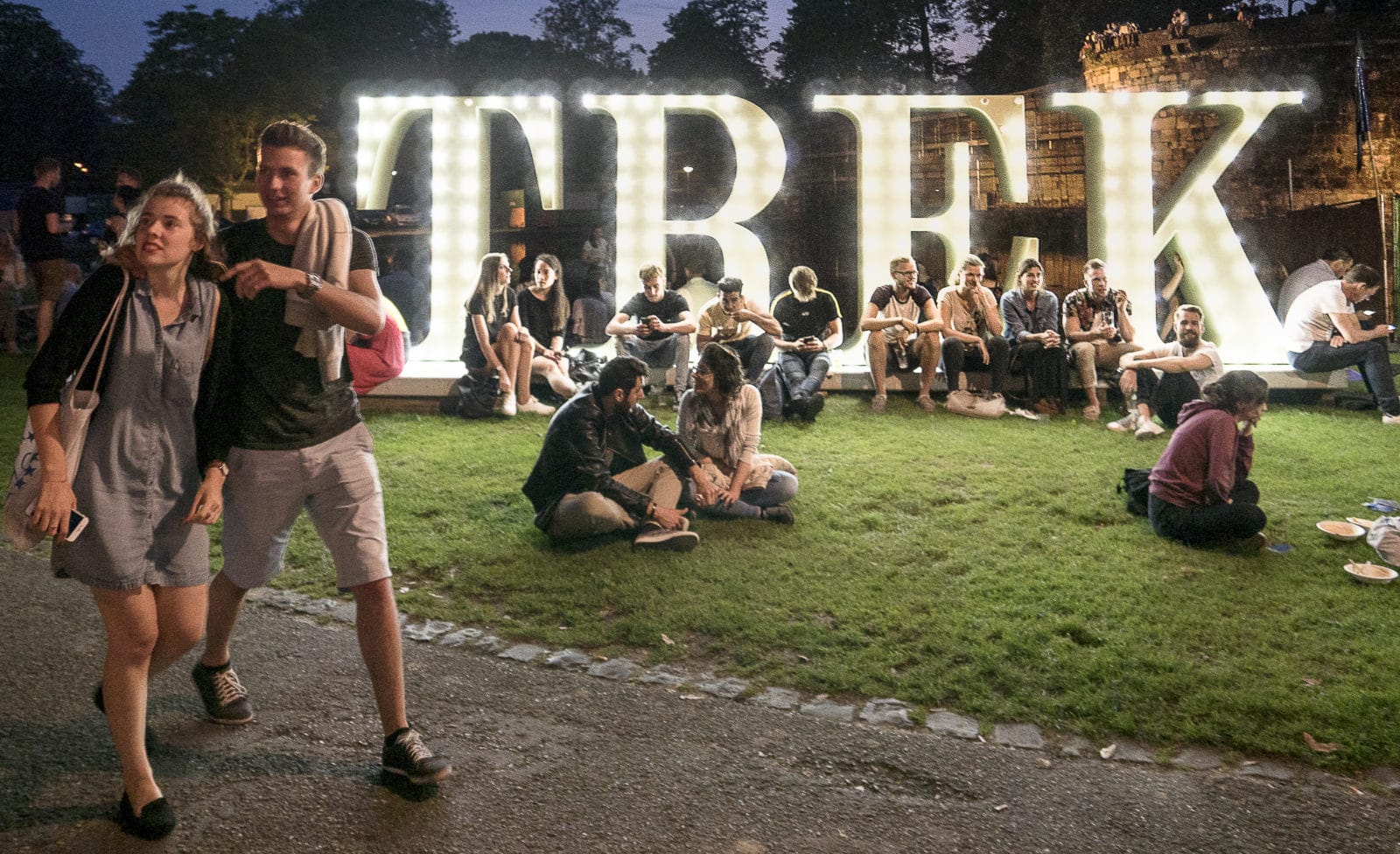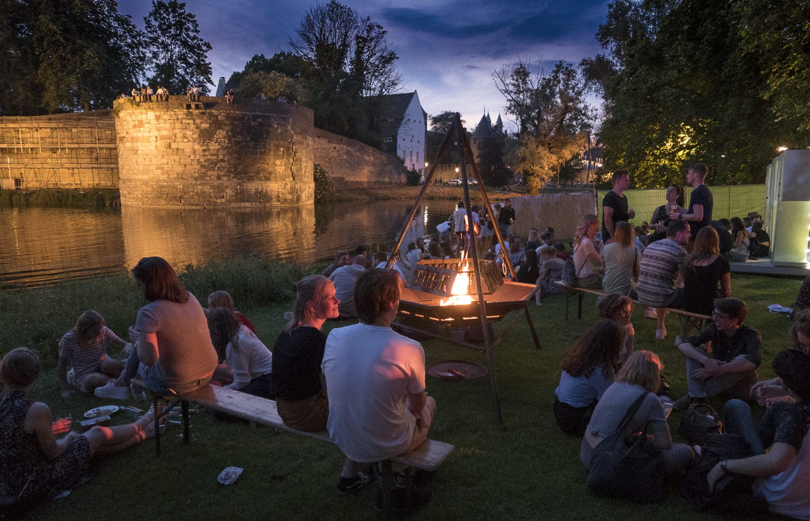 Als de schemering valt wordt het druk en gaat TREK loeien als een haardje. De letters en de gekleurde lampjes gaan aan, de haardjes aan de vijver worden ontstoken.