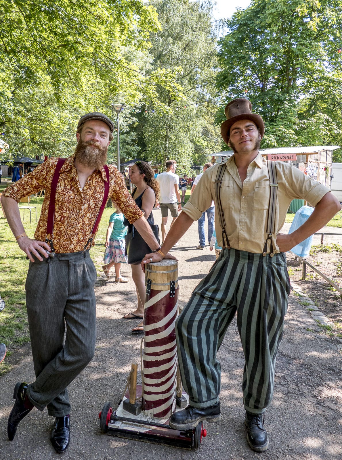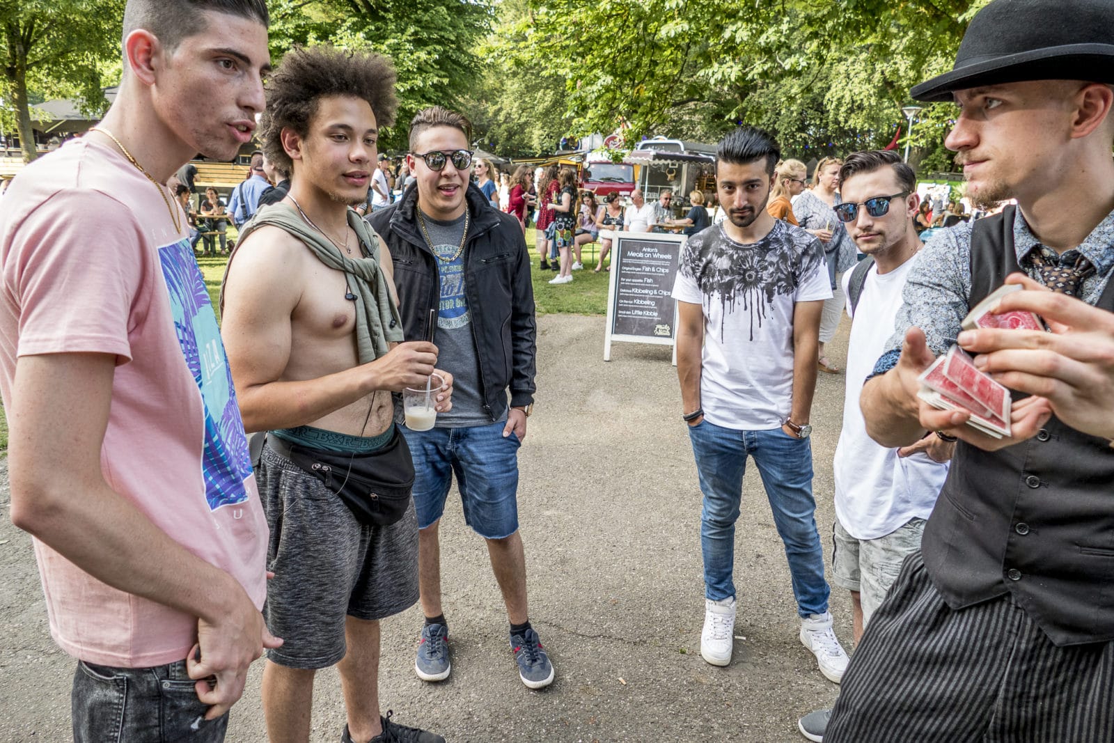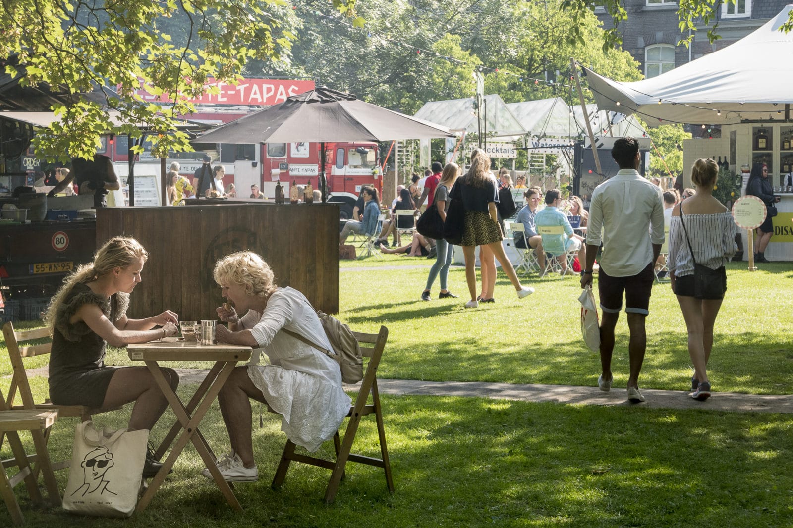 Waarom zijn jullie hier? Erwin: ‘Nou ja, het lekkere park, lekker eten, drinken, sfeer… In de avond komt er een dj, daar hou ik van.’ Erwin werkt aan een boek over de filosofie van het dagelijkse leven, een totaalvisie, zegt hij. ‘Daar past dit wel in.’ Zies speelt verveeld, een peuk wiet in de mondhoek. ‘Ik vind het wel best, veel eten.’ Of we wel de foto kunnen sturen.
