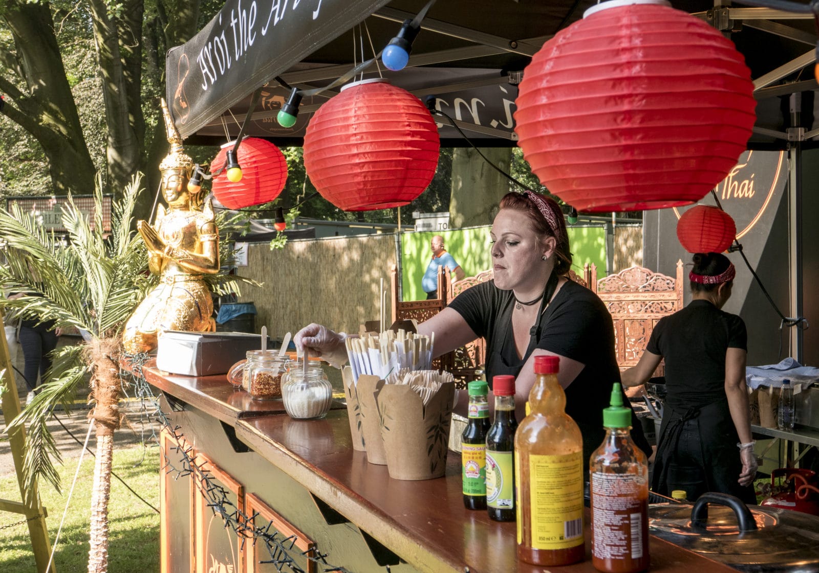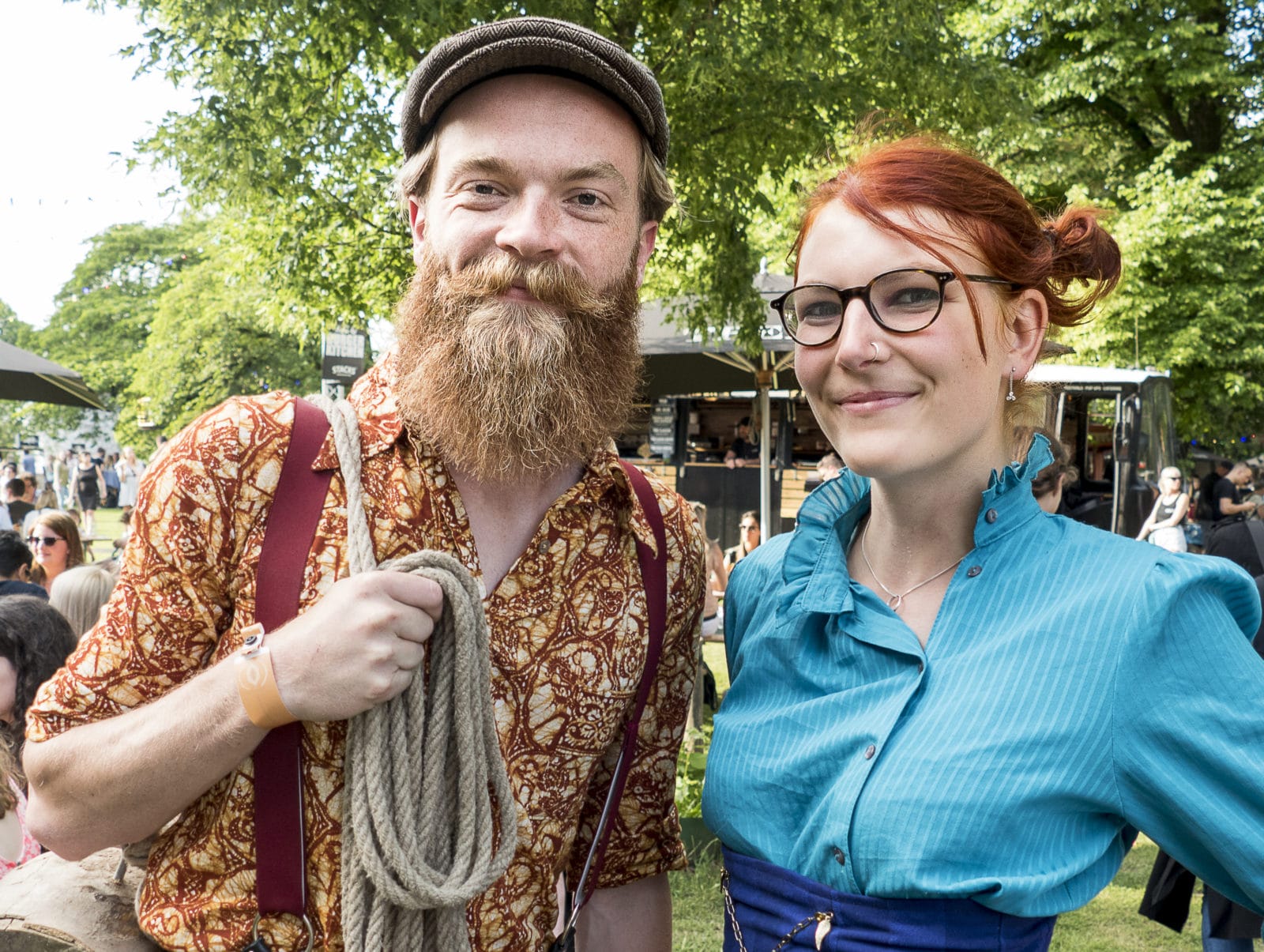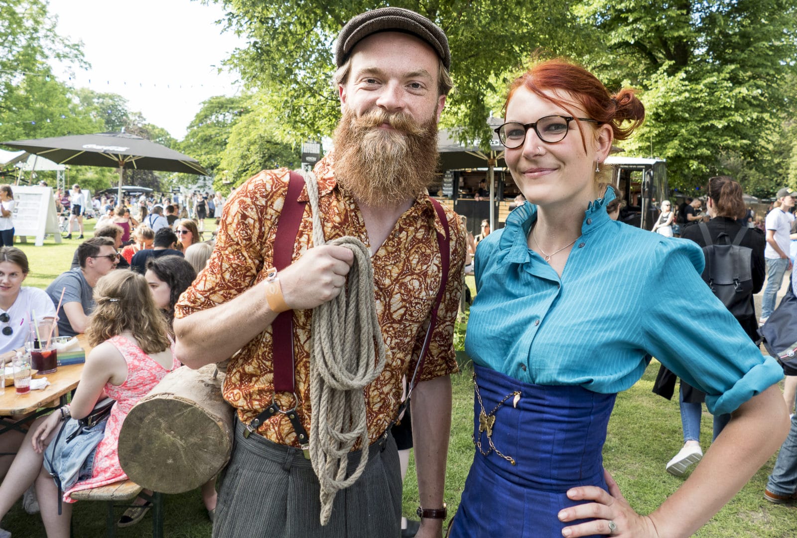 Waarom zijn jullie hier? Erwin: ‘Nou ja, het lekkere park, lekker eten, drinken, sfeer… In de avond komt er een dj, daar hou ik van.’ Erwin werkt aan een boek over de filosofie van het dagelijkse leven, een totaalvisie, zegt hij. ‘Daar past dit wel in.’ Zies speelt verveeld, een peuk wiet in de mondhoek. ‘Ik vind het wel best, veel eten.’ Of we wel de foto kunnen sturen.