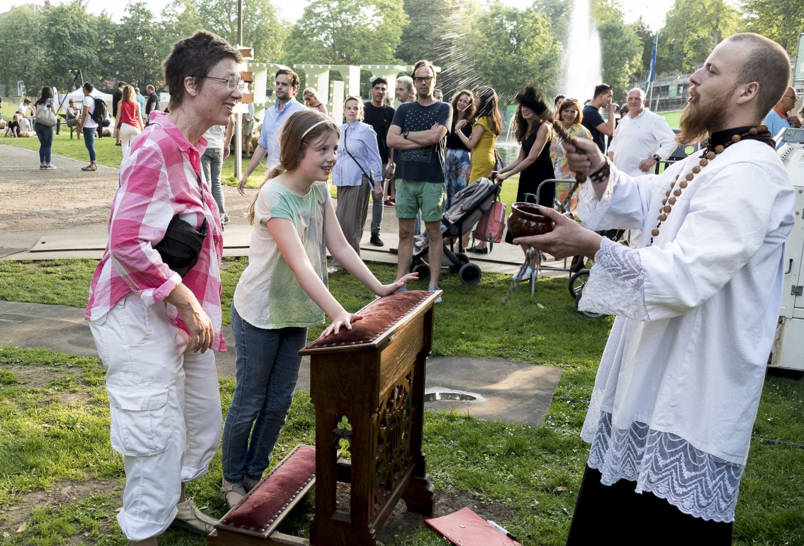 Je moet wel een ernstige misantroop zijn om het die vrijdag niet naar je zin te hebben in Stadspark Maastricht. De zon schijnt. Het is subtropisch warm met een licht lentebriesje. De locatie, naast een door stadswallen en torentjes omarmde vijver, is perfect. Onder de oude eiken staat een veertigtal foodtrucks en bars met pruttelende keukentjes op je te wachten. Oh ja, niet onbelangrijk: de toegang tot Festival TREK is gratis. De eerste kennismaking met TREK geldt niet een barista of vleesmeester maar een waanzinnig zegenende pastoor voor zijn eigen kerkje. Die omzeilend lopen we in de armen van de man die is ingehuurd is voor alle theatrale uitingen op het terrein: Adam Boutiche, de ‘eindbaas’ van Duece, Events en Entertainment.