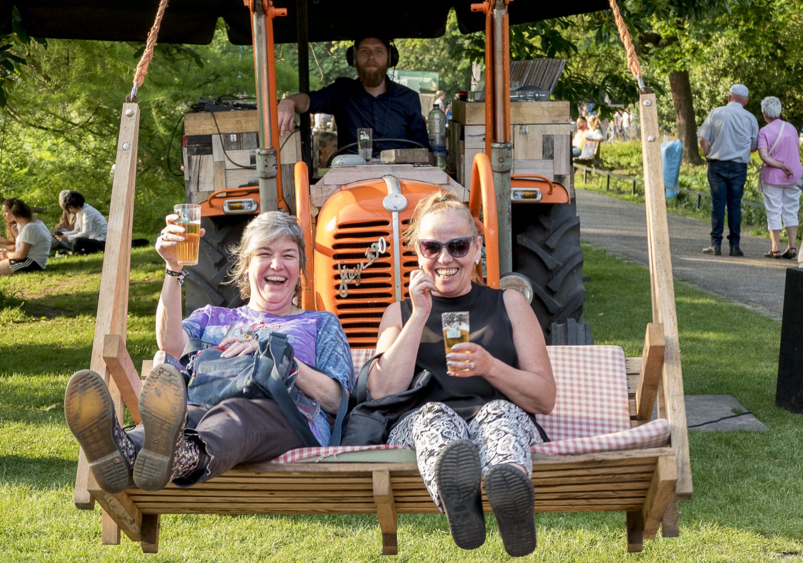 Over elke positie op het TREK-terrein is goed nagedacht. Raymon: ‘Standaard is de Platenbus voorin, met 70- en 80-jarenmuziek. In het midden staat de Tractor-dj met blues en schommel in de laadklep. Het Live Podium is achterin. Ja, er mag gedanst worden op de houten vlonders, het zomertuinidee.’ De doelgroep is 25 tot 45 jaar, kinderen zijn welkom, er wordt op ze gerekend. Ze krijgen een polsbandje met het mobiele nummer van hun ouders, voor als ze kwijtraken.