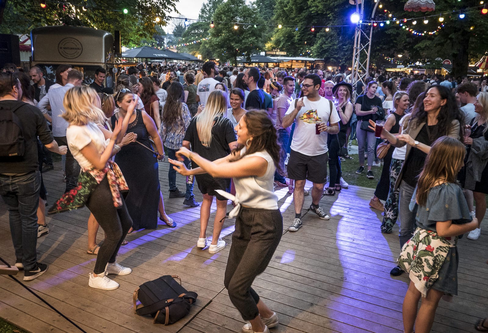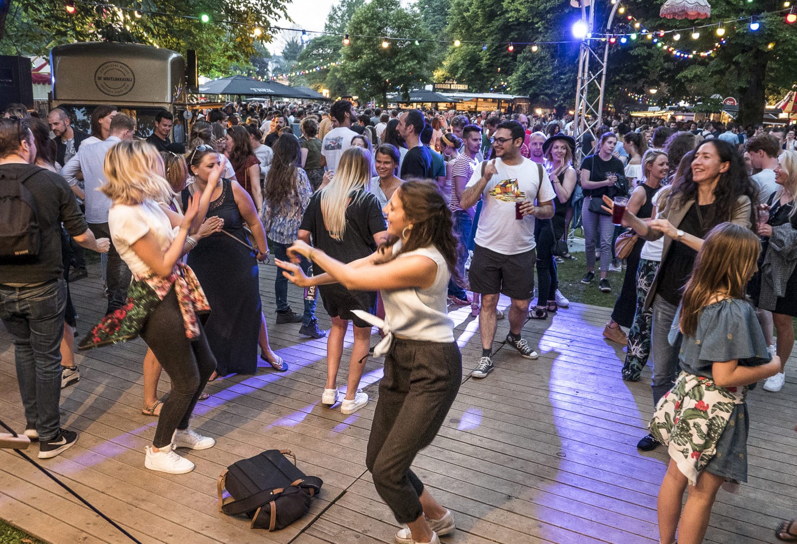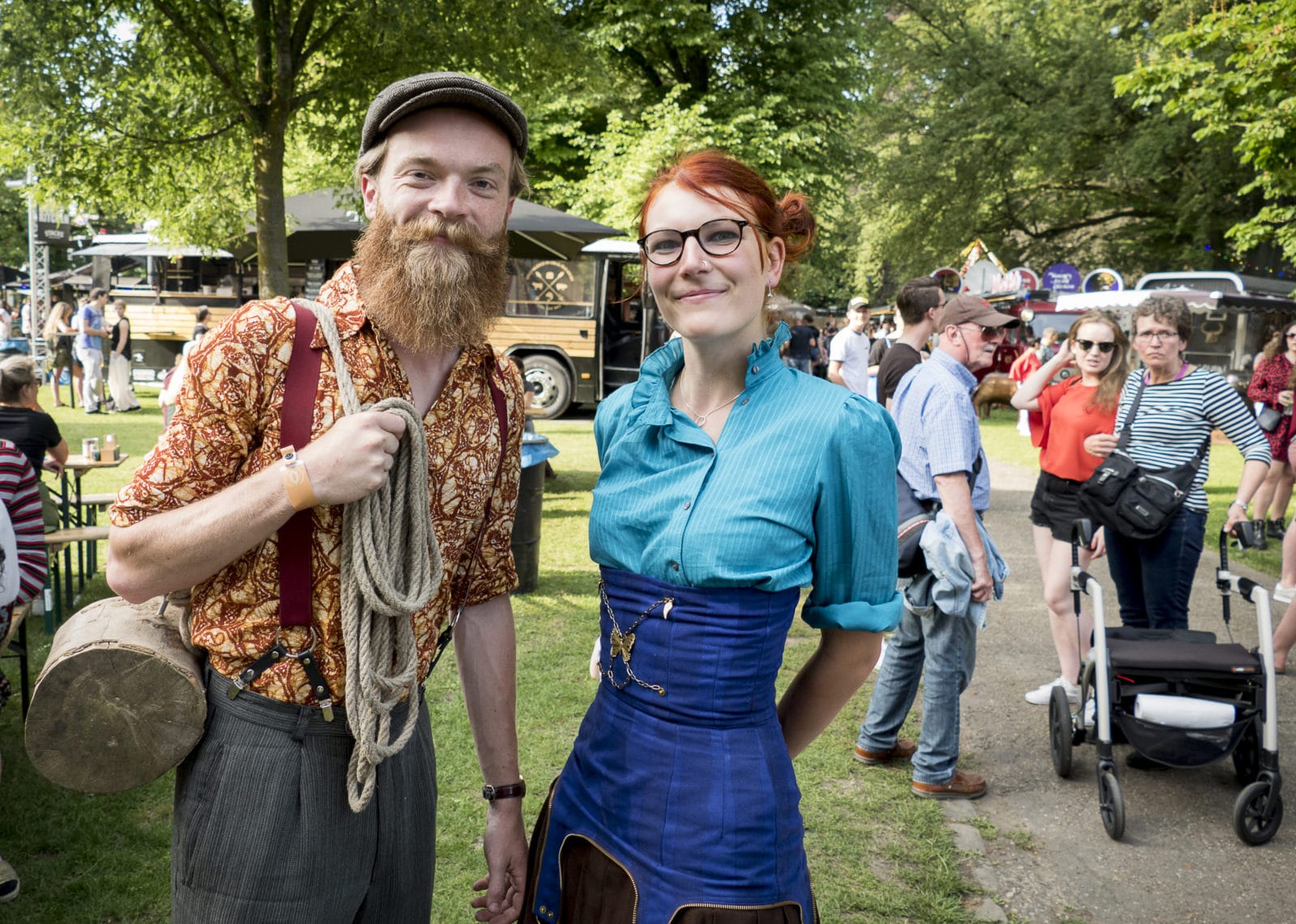 Op het grasveld voor het grote podium achterin wordt het een beetje Woodstock. Bezoekers liggen op meegebrachte kleedjes te genieten van eten, muziek en kleine theateracts. Of ze dansen alsof ze onder stroom staan. Het lage strijklicht blijft hangen in de grote bossen haar van Erwin Duijsings, vriendin Giulia Baiocchi uit Lucca (It) en Zies (‘dat moet voldoende zijn’), met z’n drieën op een kleedje.