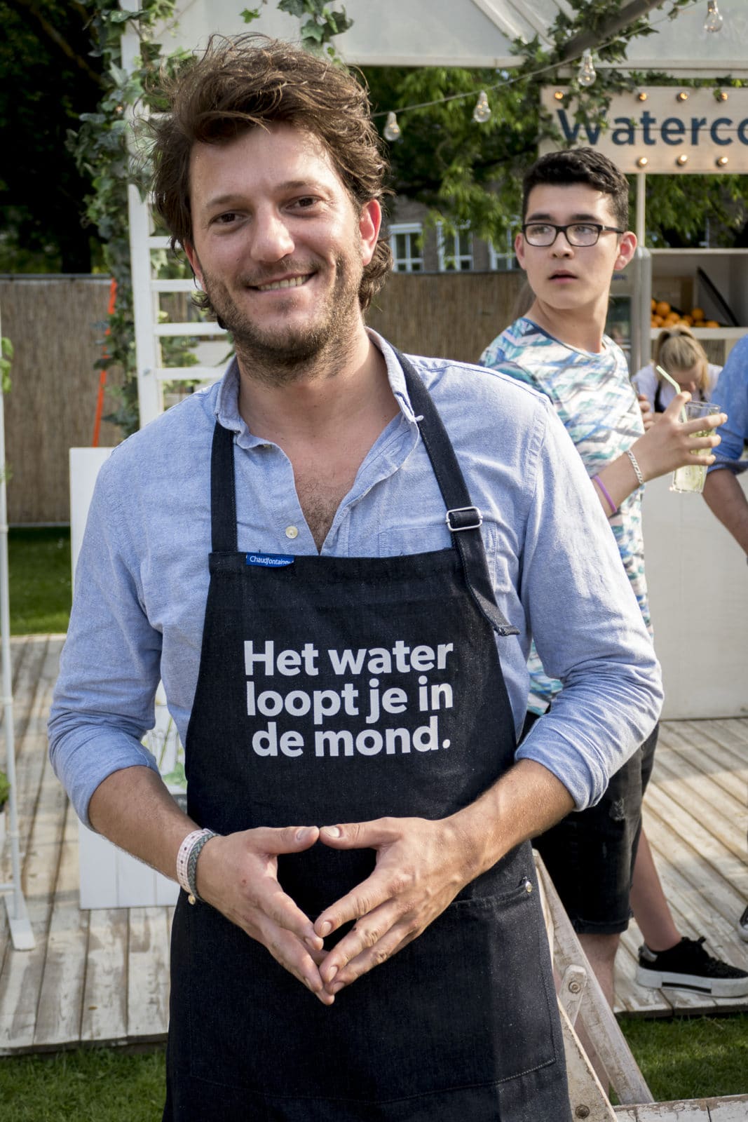Voor het eerst ruiken we de commercie. Bij de Watercocktailbar, een frisse en sprankelende inrichting, lopen we tegen Freek van Noortwijk op, een mooie jongen met de tekst ‘Het water loopt je in de mond’ op zijn schort. Freek (29) is chef-kok en mede-eigenaar van vier restaurants in Amsterdam, jurylid bij