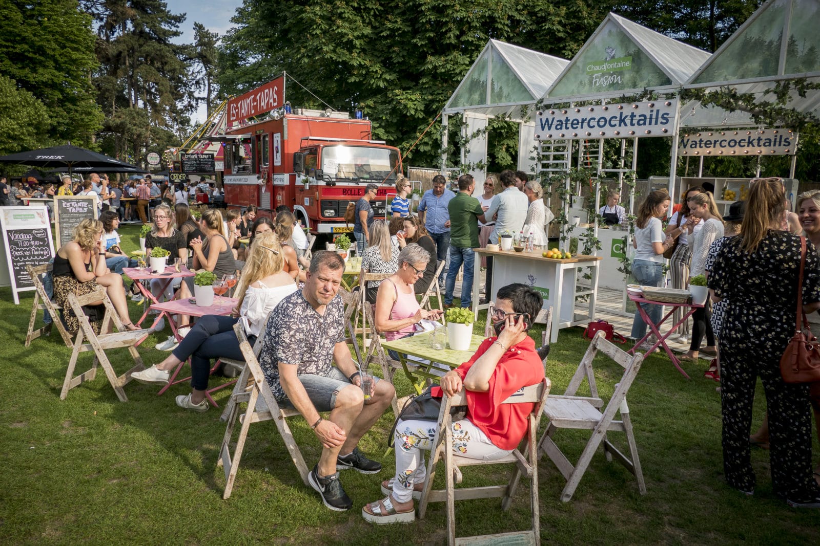 Verder achterin komt de verzameling foodtrucks tot volle ontplooiing. In totaal staan er 38 foodtrucks, 6 verschillende soorten bars en een legio aan decorstukken op het terrein, zoals het ‘gemeentehuis’ annex theater, de nostalgische rups, de TREK-letters, het kerkje, een piramide van houten blokken waarop je zit en klautert, tafelvoetbalspellen en de ’s avonds ontstoken haardvuren. Het eet- en drinkaanbod kust alle hoeken van het culinair heelal: burgers, falafel, poffertjes, Vietnamees, tapas, wafels, paella, pokebowl, oesters, coconuts pastry, ‘Fritez’, gin-tonic, watercocktails, wijn en bier. Raymon van Sprang: ‘We passen de keuze van foodtrucks aan bij de bestemming. Ja, er is meer vraag dan aanbod dus we kunnen scherp selecteren.’