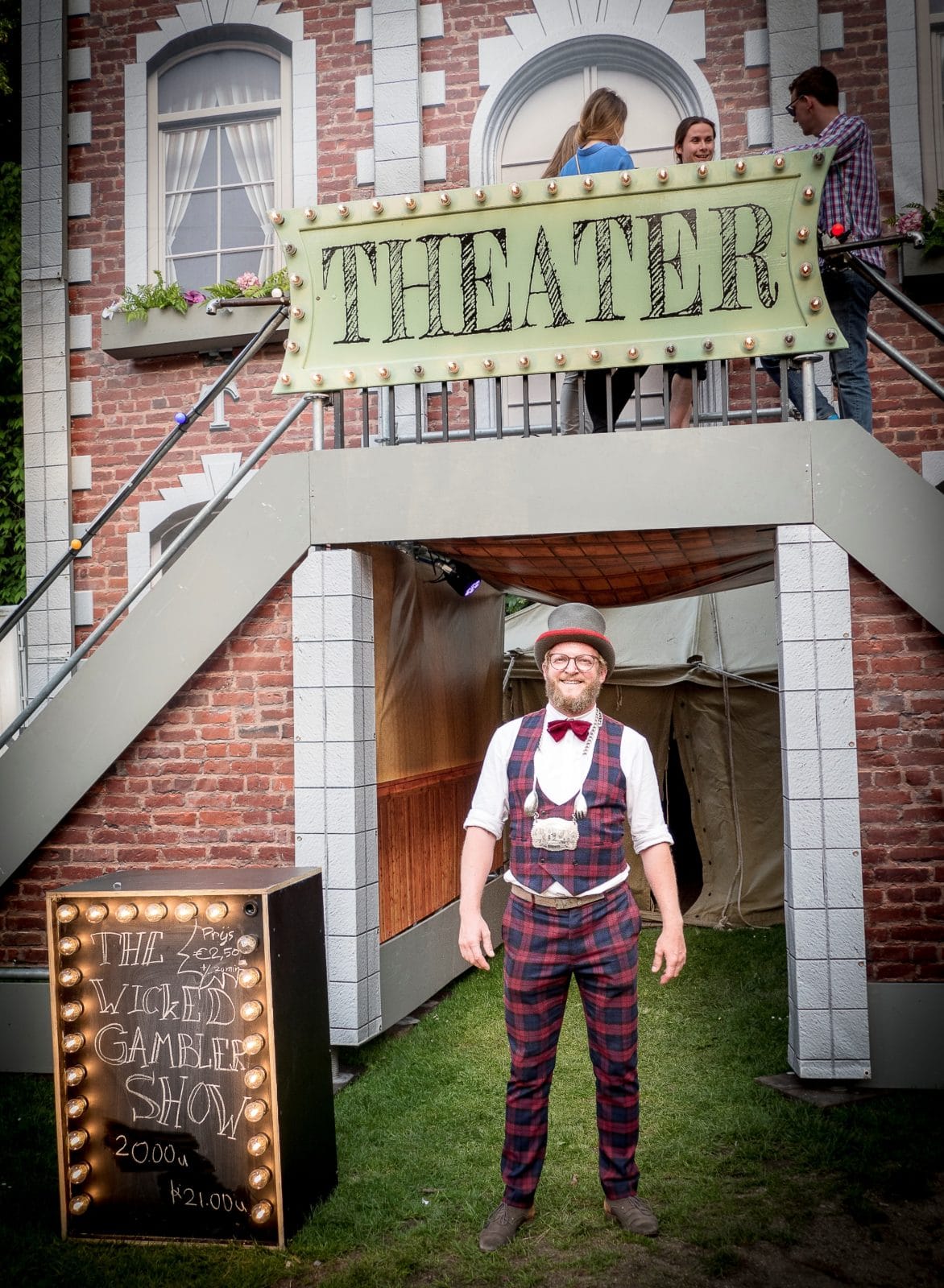 Dyan, ‘The Wicked Gambler’, ook lid van Adams Duece-team, doet wat kaarttrucs in de buurt van het podium. Het dansende meisje heet Norn, zij noemt zich ‘een all round entertainer’. Maarten, een rossige met baard, doet spel en theater. Hij verklapt de werkwijze: ‘We doen dingen met mensen in een kleine cirkel, boksen, een quizje, verkleedpartijtjes. Maar kijk naar Maarten: een hele brede kring mensen leeft vanaf een afstandje mee. Het concept, eten met theater, werkt. Je kunt niet de hele dag eten en drinken.’