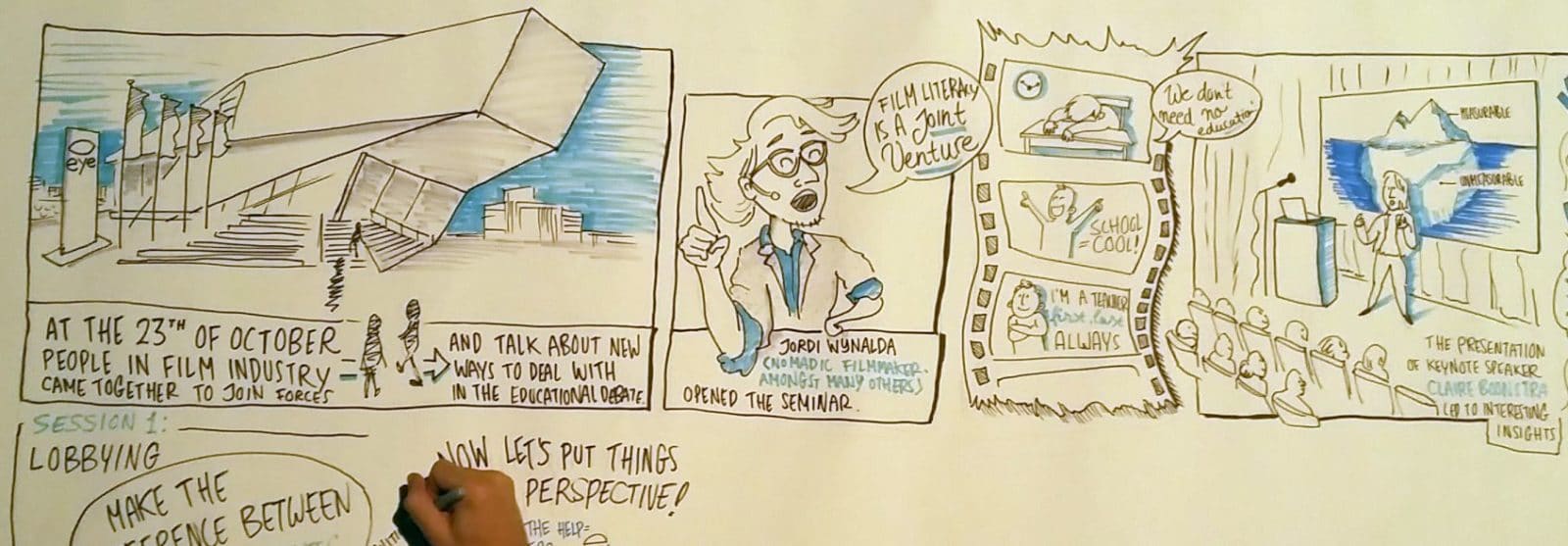 Een kant en klaar stappenplan leverde de sessie niet op, maar er verschenen genoeg suggesties op de flipover. Alle vormen van bewegend beeld inzetten, van cinema tot vlogs; leerlijnen ontwikkelen, samenwerken en inspireren; lobby voor lerarenopleiding; bestudeer het belang van creativiteit; enzovoorts.