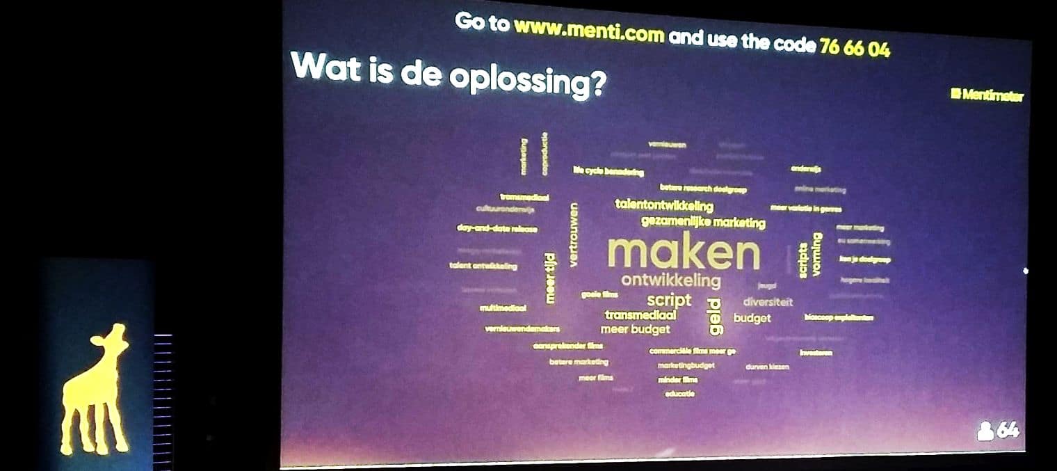 Bij wijze van aftrap kunnen de aanwezigen in de zaal – veel producenten, weinig exploitanten en regisseurs – via hun smartphone direct hun suggesties op het scherm toveren. Wat zou bijvoorbeeld de oorzaak kunnen zijn van de vrije val waarin de Nederlandse film lijkt te zijn geraakt? En wat de oplossing?