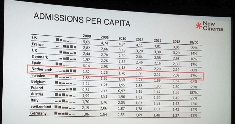 Overigens is het uitgangspunt tamelijk comfortabel. In haar openingswoord onthult NVBF-voorzitter Winnie Sorgdrager dat 2019 qua bioscoopbezoek in de richting van een topjaar gaat. Zo zijn er meer feiten die aangeven dat Nederland het in Europa lang niet slecht doet. Gemeten naar bezoek is bijvoorbeeld de Top 20 minder dominant dan in andere landen.