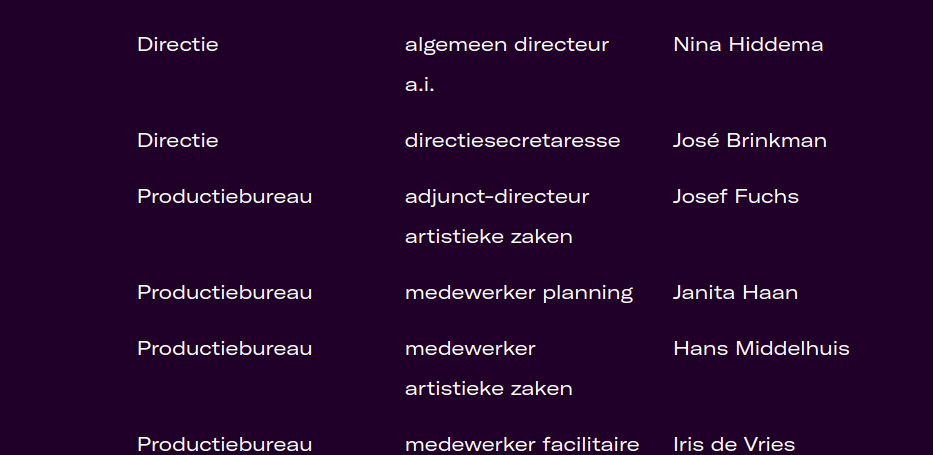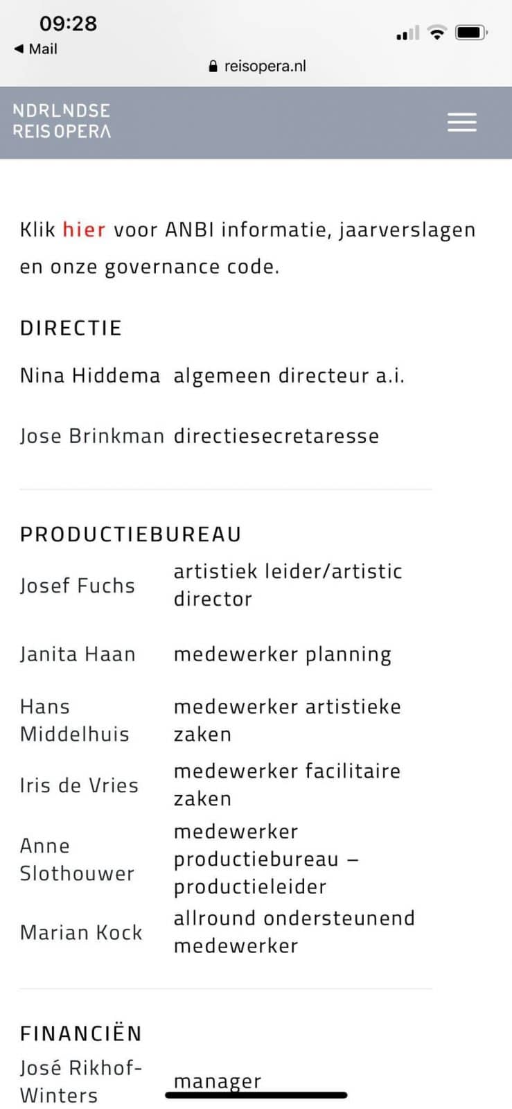 Geen grote naam dus, en het is even de vraag of subsidiënten als de Raad voor Cultuur hier echt blij mee zijn. Toen de onrust vandaag via Facebook boven tafel kwam, duurde het ongeveer een uur voordat de Nederlandse Reisopera reageerde. De webpagina met daarop de functies van de medewerkers verdween van het net, om even later terug te komen. Met een andere vormgeving, maar verder dezelfde namen en functies. Behalve één: achter de naam van Joseph Fuchs stond niet langer ‘Artistiek leider/Artistic Director’, maar ‘adjunct directeur artistieke zaken’.